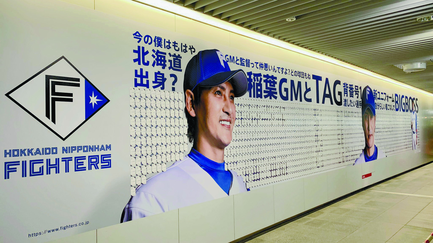 日本ハムは24日、札幌駅前通地下歩行空間に巨大広告を掲出した。新庄監督や主力選手のイメージ画像に加え、発表されたばかりの新ユニホームや監督の名刺約4000枚が並んだ。札幌市営地下鉄全線全車両の窓上や同地下鉄の主要駅でも広告を展開。2022年シーズンの開幕に向け、PRが進む。