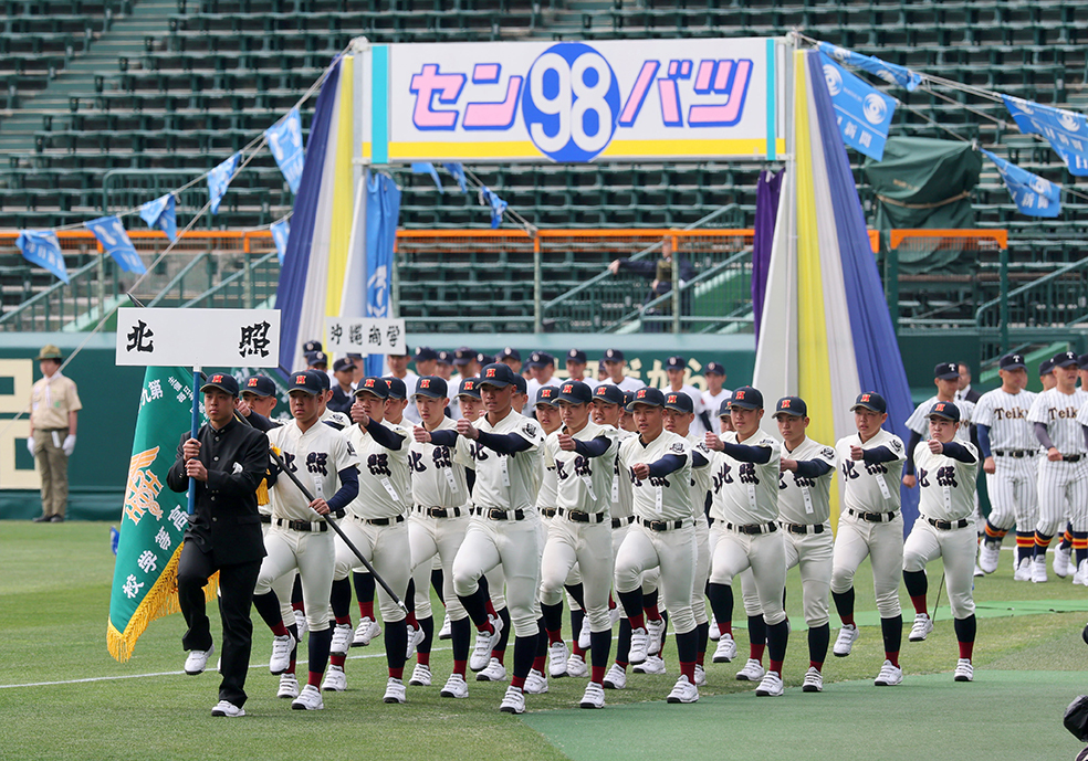開会式リハーサルで入場行進する北照ナイン=撮影・畠中直樹