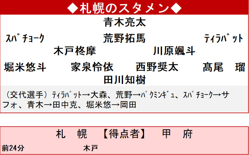 北海道コンサドーレ札幌はグループ首位のヴァンフォーレ甲府と対戦し、1-0で勝利した。今季初の2連勝を飾るとともに、待望の今季ホーム初白星を手にした。試合後会見での川井健太監督(44)の一問一答は以下の通り。