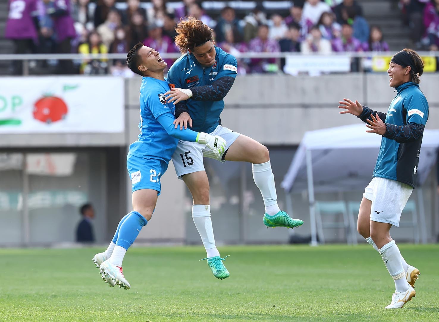 PK戦で勝利し、DF家泉(中央)と喜ぶGK田川(左)。右はDF西野
