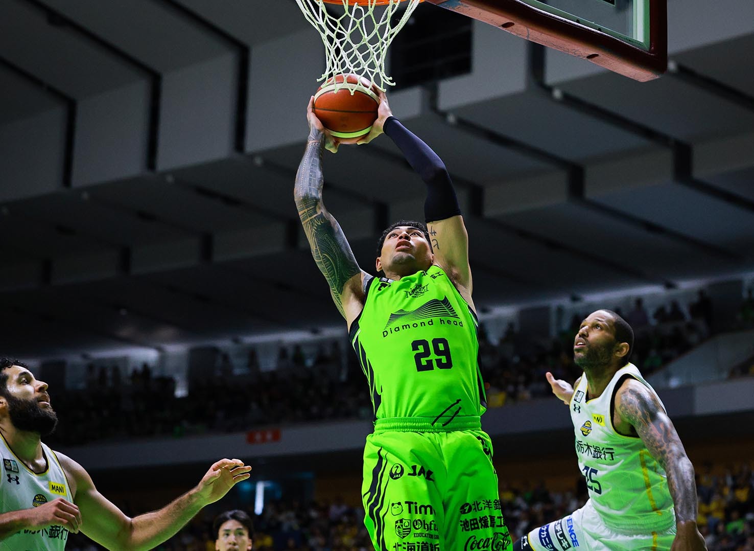第2Q、ダンクシュートを決めるPFマックス・ヒサタケ(中央)