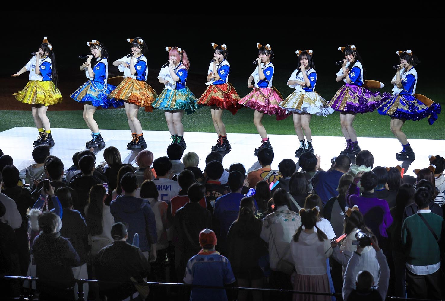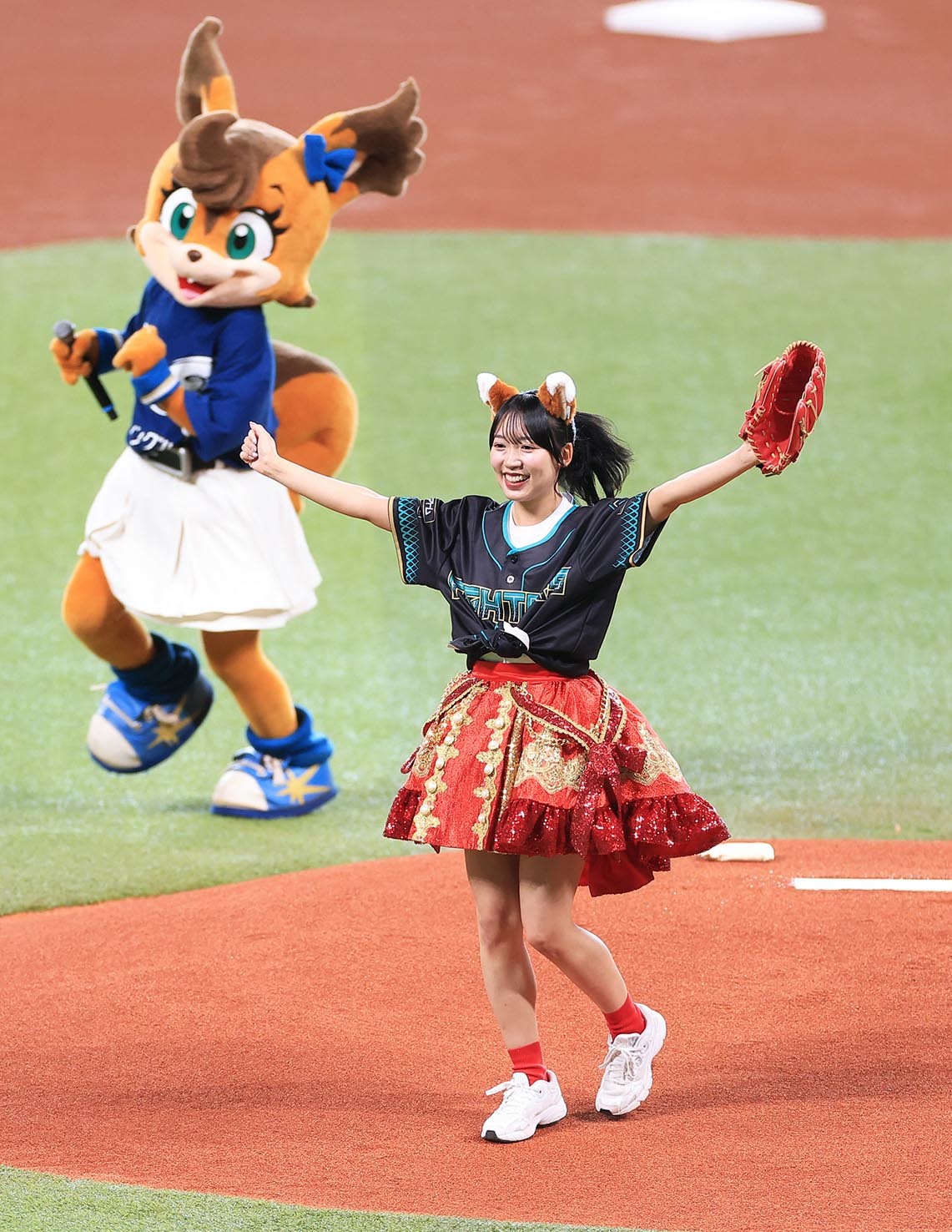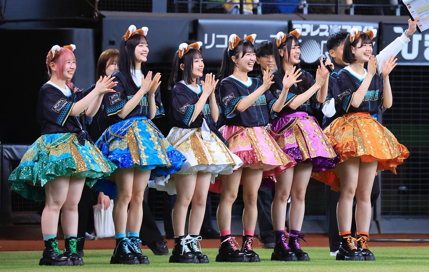 9人組アイドルグループ「Appare!(あっぱれ)」が11日のソフトバンク戦(エスコン)に登場し、メンバーの朝比奈れいが2年連続のファーストピッチを務めた。三回終了後には「きつねダンス」を踊り、試合後は「AFTER GAME」のライブでエスコンを盛り上げた。12日に札幌近松で開催される10周年ライブツアーへの意気込みも語った。