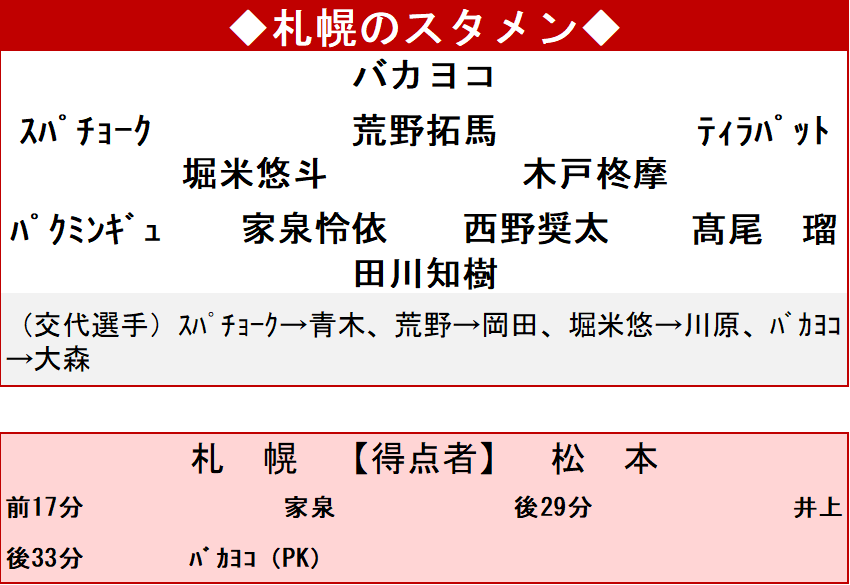 北海道コンサドーレ札幌は百年構想リーグ第11節で松本山雅FCと対戦し、2-1で勝利した。前半17分にDF家泉怜依(26)が右CKのこぼれ球を頭で流し込んで先制。後半29分に1点を返されたが、同33分にFWアマドゥ・バカヨコ(30)が今季3度目のPK弾を決めて勝ち越に成功した。クラブ創立30周年を16日に迎え、サポーターの間では〝聖地〟と呼ばれる札幌厚別公園競技場での3年ぶりの試合で連敗を「2」で止める勝ち点3を奪った。試合後の川井健太監督(44)の一問一答は以下の通り。
