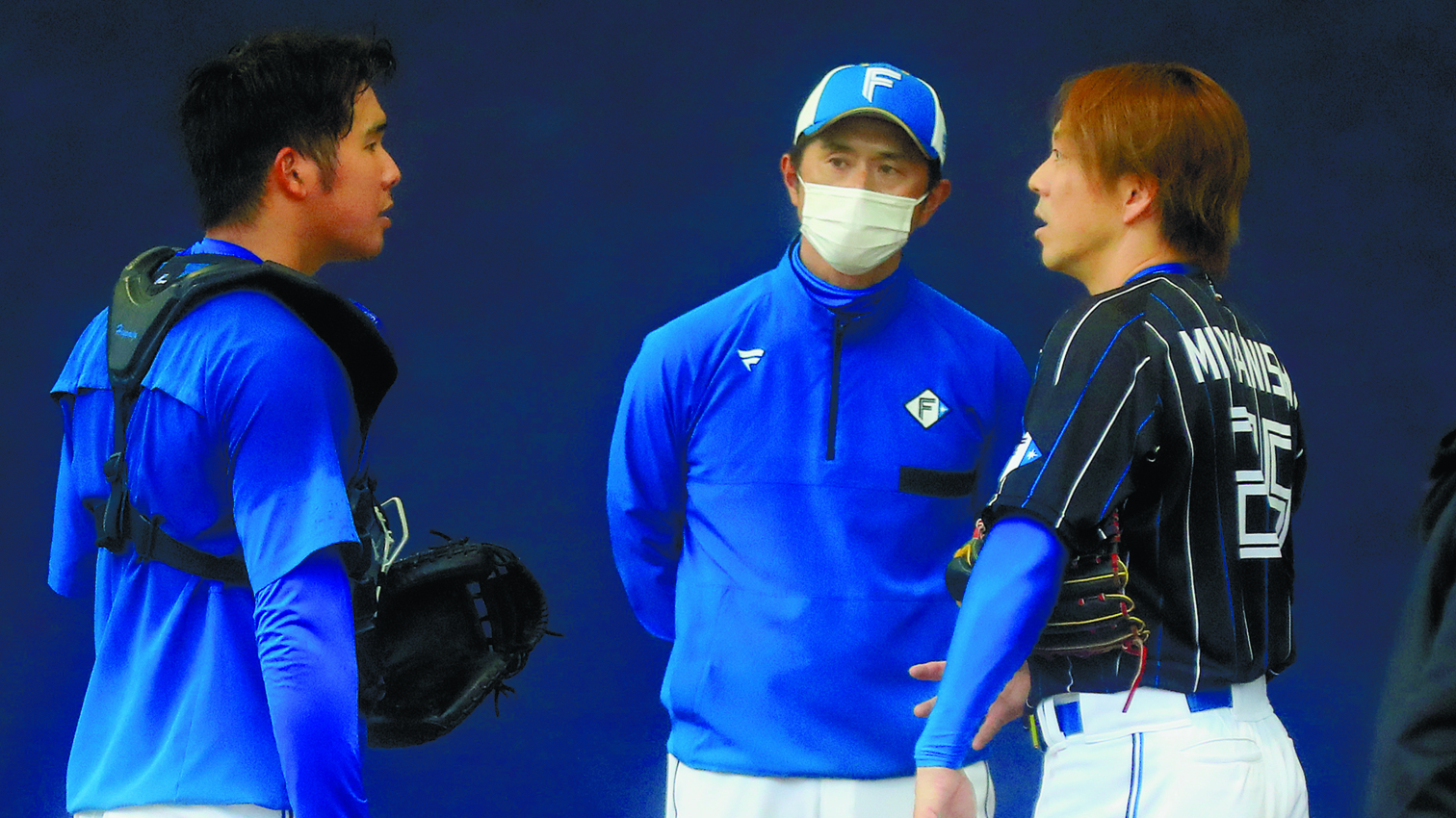ブルペン投球中の宮西に、新庄監督が「速水はバッティングがいい。キャッチャーを何とか育てたいから育ててくれ」と耳打ち。受ける捕手がルーキーの速水に代わり、14年連続50試合登板を誇る鉄腕サウスポーの講義が始まった。