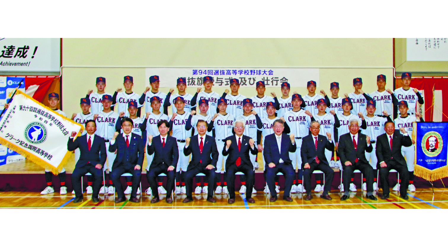 第94回選抜高校野球大会(3月18日開幕、阪神甲子園球場)に初出場するクラークでセンバツ旗授与式と壮行会が28日に行われた。全国にキャンパスがある同校は、オンラインでその模様を配信。白取太郎主将(2年)は、春夏通じて甲子園初勝利を約1万人いる生徒に誓った。チームは抽選会のある4日に北海道を出発。対外試合が解禁となる5日から道外で最終調整を行い、そのまま大阪入りする予定だ。