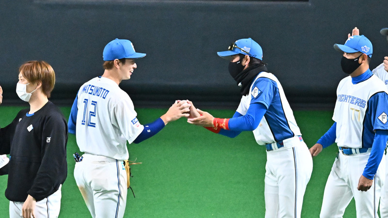 コーチ陣とグータッチした後、ベンチに戻ってくる選手と右手でハイタッチを交わした。左手には松本剛から手渡されたウイニングボールをそっと抱えた。「札幌ドームに飾ってもらおうかなと思う。最後の年に」。ファイターズの歴史を語る上で貴重な宝物になるが、みんなで共有することを望んだ。