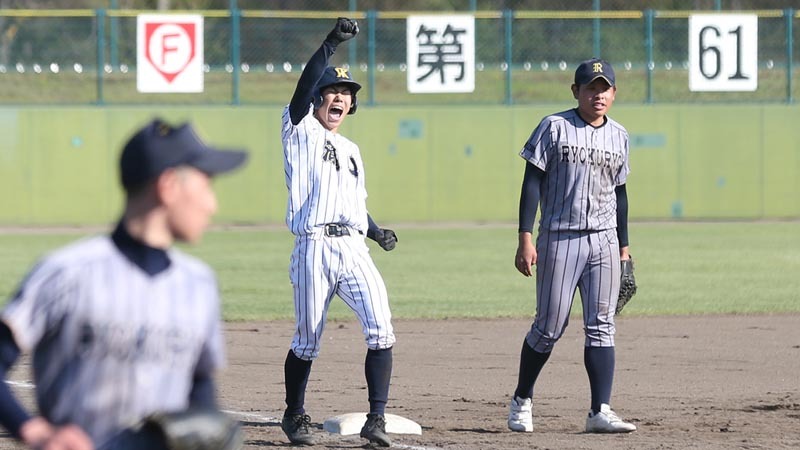 3点を追う九回、先頭打者の四球から3連打で同点に追い付くと、1番・川上蓮(3年)が、2死二、三塁から左翼手の頭を越える値千金の勝ち越し2点三塁打。この回一挙6点を奪い、その裏は岩緑陵の猛追を1点差で振り切った。川上は前の打席で凡退していたが、「真っすぐでポンポン攻めてきていたので、狙っていた」と、決勝打に涙を流して喜んだ。