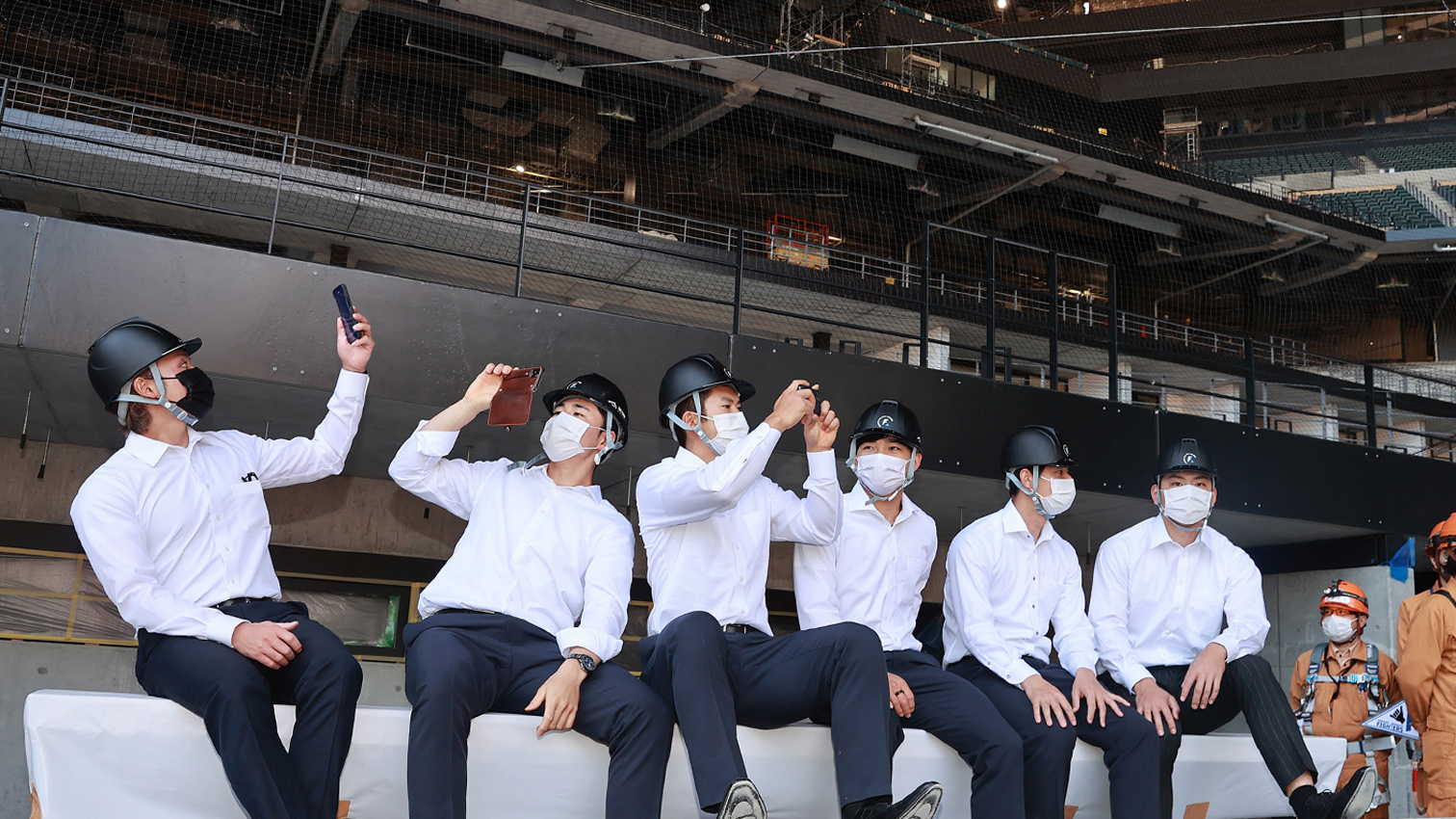 徐々に球場として形成され、すでに外観からは重厚感が漂っていた。フィールドや客席、ベンチなども目で見てわかるようになり、見学していた選手たちは興奮気味に会話に花を咲かせていた。