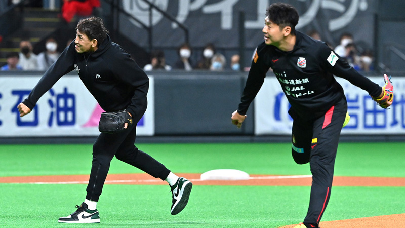 北海道コンサドーレ札幌の河合竜二CRC(コンサドーレ・リレーションズチーム・キャプテン)とレバンガ北海道の折茂武彦代表がファーストピッチを務めた。2人は揃ってストライクを投げ込み、大きな拍手を浴びた。河合CRCは「プロのチーム、クラブが手を取り合って活動していくことが、北海道のためにもいいこと」と力説。今月18日に引退試合を控えている折茂代表は「プロスポーツを通じて北海道の皆さんを元気にしていけるように頑張っていきたい」と決意を込めた。