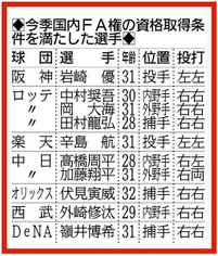 優れた実績を持つ選手がFA宣言した場合、他球団との競合は必至だ。今季は西武・外崎やロッテ・中村奨らがすでに権利を取得済みで、これから西武・森や広島・西川、巨人・丸、阪神・西勇らも取得見込みだ。指揮官は自ら条件交渉に関わるつもりで「そりゃ、いきますよ。(資金が)足りなかったら俺が出すしかない(笑)。そのくらいの気持ちですよ」と訴えた。身銭を切る形での補填(ほてん)も辞さない―。前代未聞の奥の手まで明かし、強い覚悟を示した。