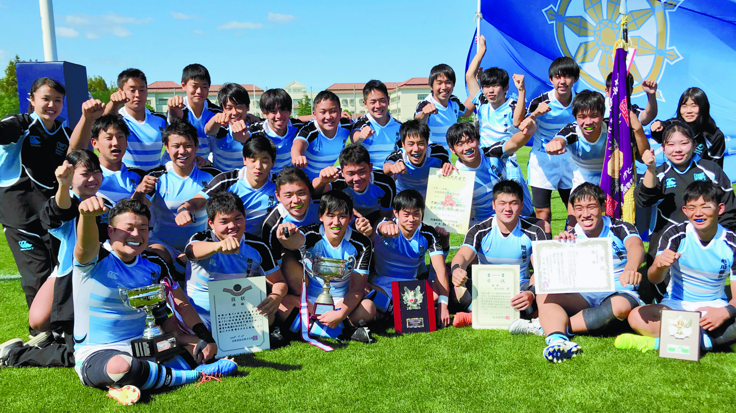 旭龍谷が修正力の高さを見せつけた。準決勝までは右からの展開でパスミスが多発。24日の休養日練習で修正に取り組むと、遠軽戦では右ウイングの能祖(のそ)旺佑主将(3年)が2トライ。「最初にトライを決めて、チームの雰囲気も良くなった」と接戦を制し、喜びを爆発させた。