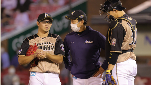 マウンドでは栗山監督が鈴木健に声を掛ける