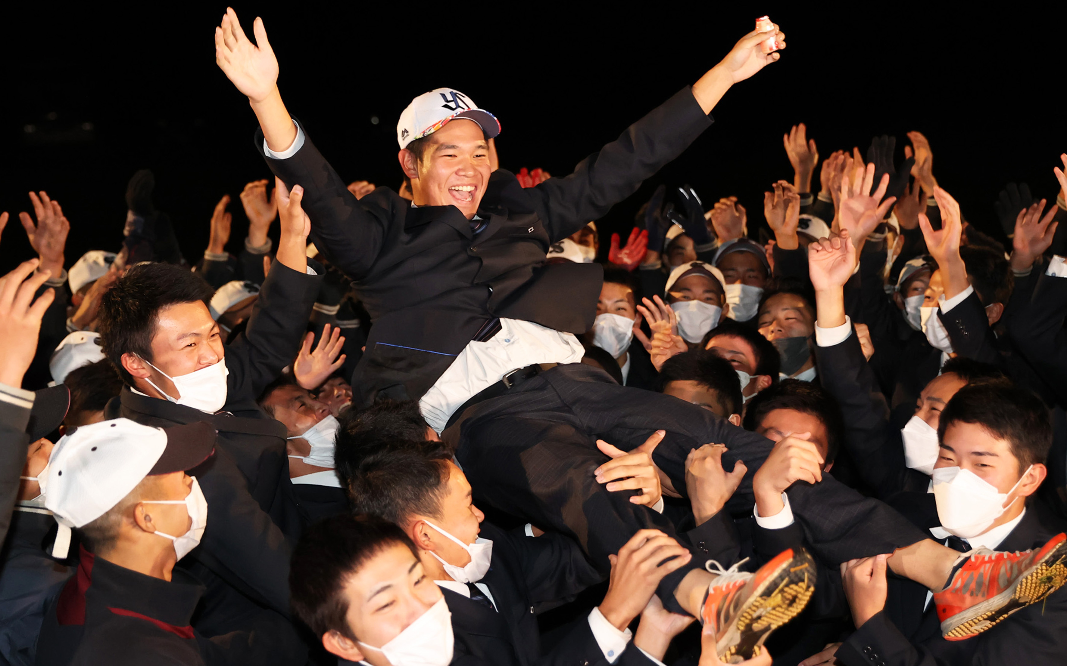 〝離島のエース〟坂本拓己投手は知内高で両親や野球部の吉川英昭監督らと吉報を待った。そして、ヤクルトが4位指名。主人公は硬い表情から笑顔に一変。母・陽子さん(53)は涙を流し息子と握手。同校出身初のプロ野球選手誕生。「自分が活躍して、知内高の名前を広めたい」と抱負を語った。