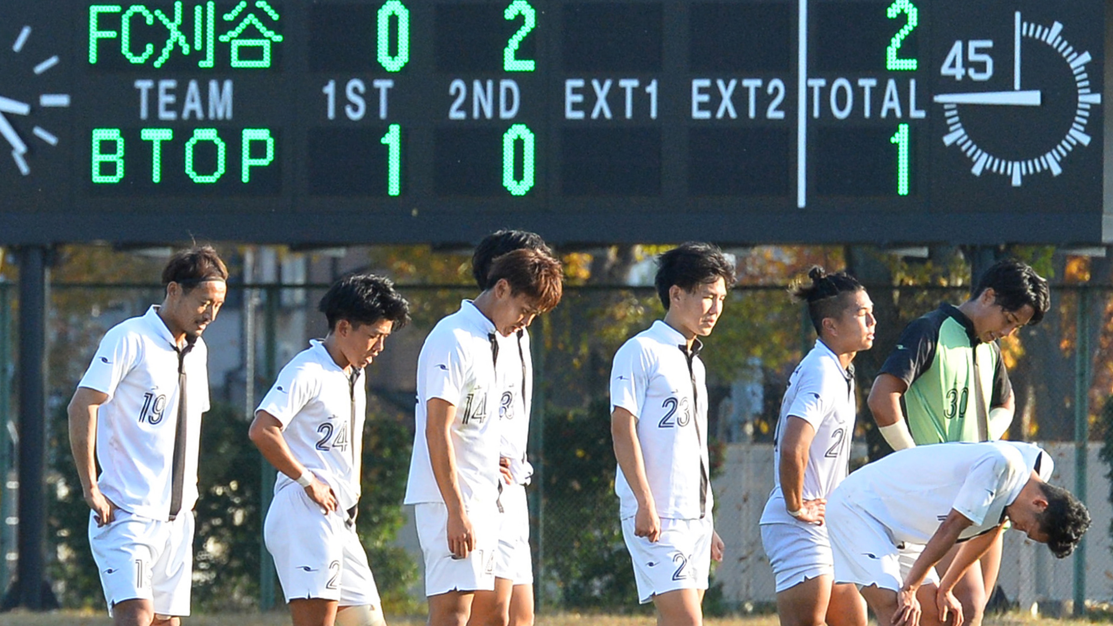 後半26分に同点に追いつかれると、同39分にはDF川里光太郎(34)が相手の決定機をファウルで止めて一発退場。流れを引き戻せないまま、ロスタイムの悲劇を招いた。西野虎太郎監督(25)は悔しさをかみ殺し「僕の責任」と語った。