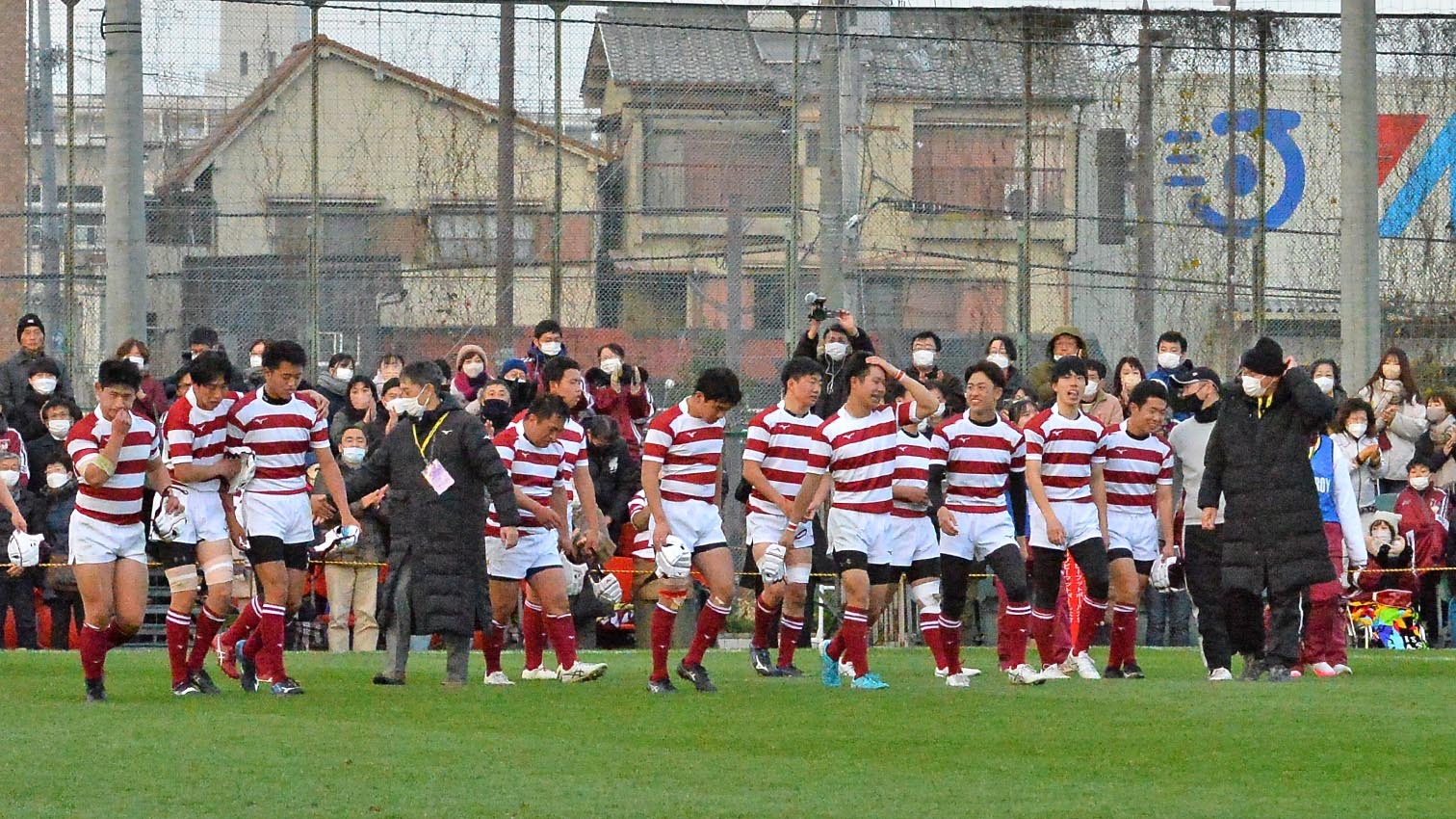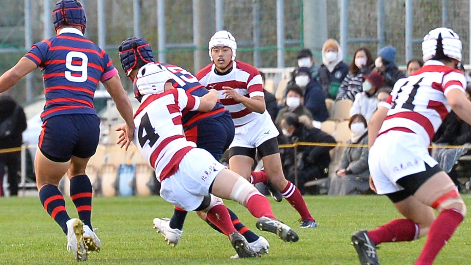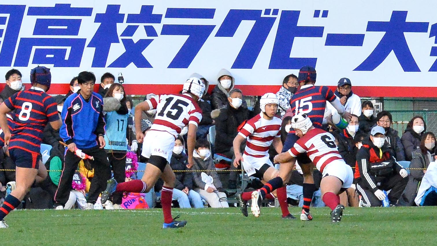 にトライを許し逆転されたが、ここから粘りの守備を見せる。24分には連続攻撃を受け、相手FWにインゴールまで進入されるが必死のディフェンスでトライを阻止。27分にも、自陣右サイドを崩されて突破されるが、SH大西粋綺(いき、3年)が必死に追いかけ、ゴールライン手前でタックルし相手をストップ。絶体絶命のピンチを救い、前半を3-5と僅差で折り返した。