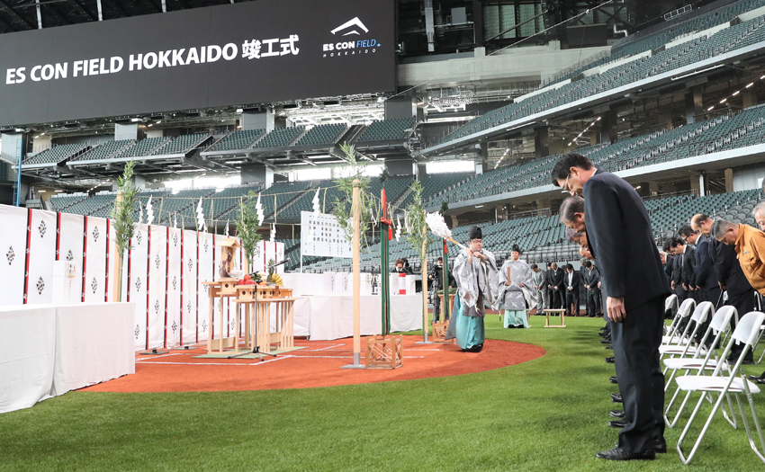 今年3月に開業する日本ハムの新球場「エスコンフィールド北海道」の竣工(しゅんこう)式が5日、北海道北広島市の同球場で行われた。球団、北広島市の職員、設計、施工の関係者ら約300人が参列。国内初となる開閉式屋根付き天然芝球場の完成を祝い、繁栄を祈念した。