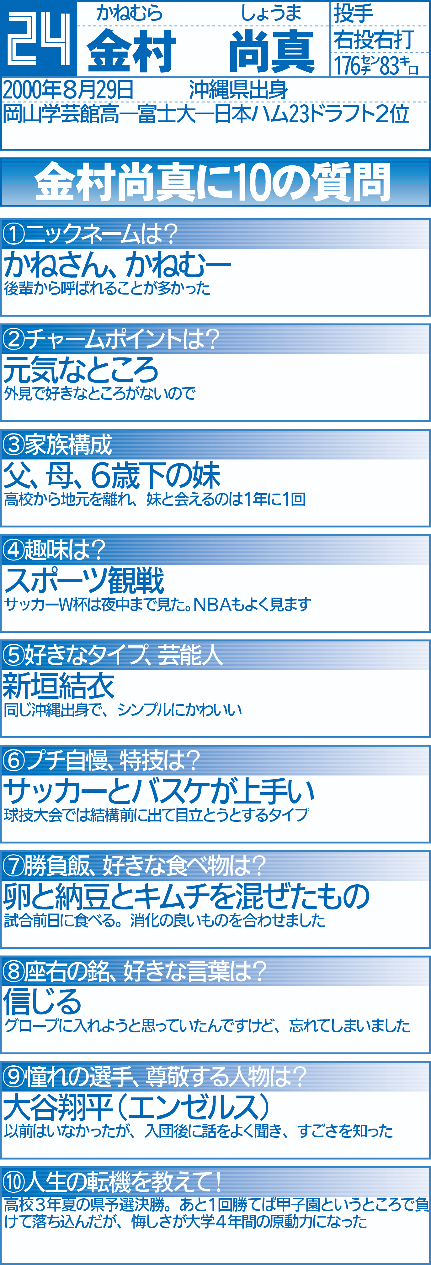 2023年、支配下と育成を合わせて10人のルーキーが日本ハムに入団。二刀流、元メジャーリーガーなど、個性豊かな顔ぶれが揃った。道新スポーツウェブでは、2月1日から始まる春季キャンプを前に、素顔が垣間見えるオリジナルの新人名鑑を作成。基本情報にプラスして、軟らかい話題を多く取り入れた「10の質問」に答えてもらった。2人目はドラフト2位の金村尚真投手(22=富士大)。