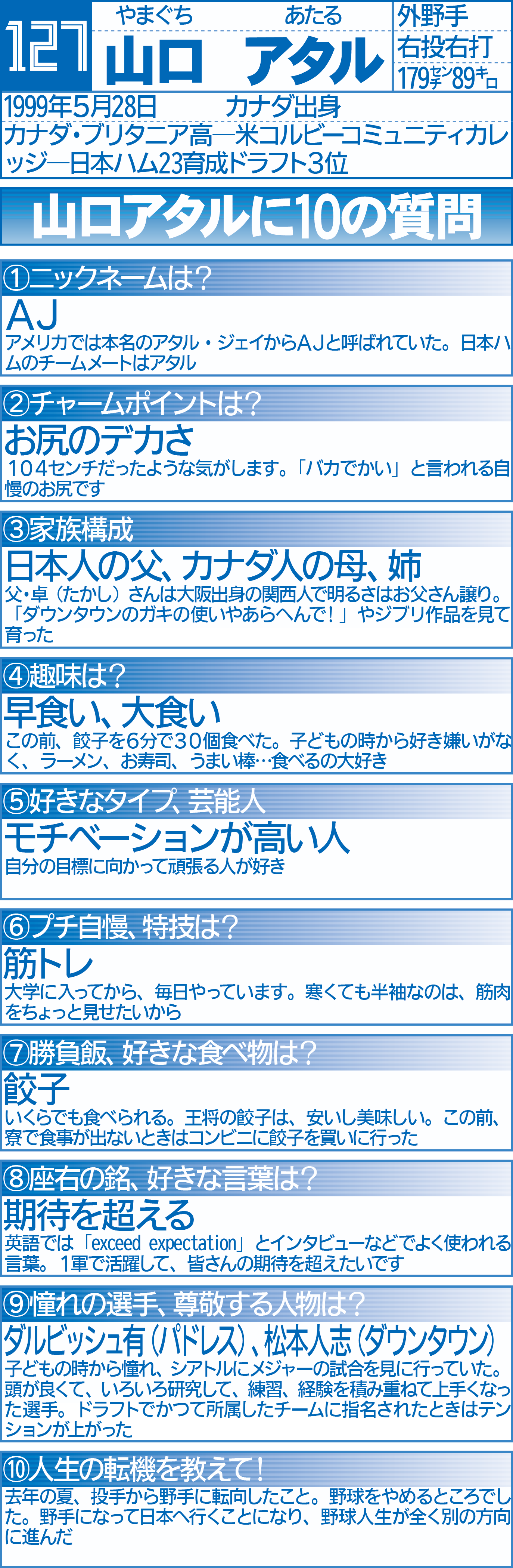 2023年、支配下と育成を合わせて10人のルーキーが日本ハムに入団。二刀流、元メジャーリーガーなど、個性豊かな顔ぶれが揃った。道新スポーツウェブでは、2月1日から始まる春季キャンプを前に、素顔が垣間見えるオリジナルの新人名鑑を作成。基本情報にプラスして、軟らかい話題を多く取り入れた「10の質問」に答えてもらった。9人目は育成ドラフト3位の山口アタル外野手(23=米コルビーコミュニティーカレッジ)。