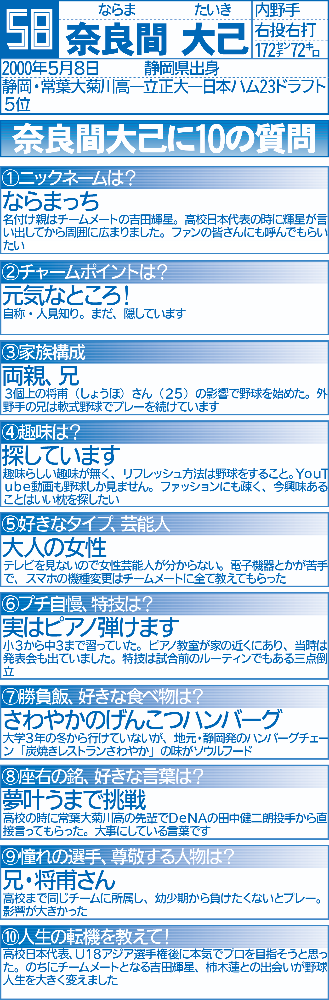 2023年、支配下と育成を合わせて10人のルーキーが日本ハムに入団。二刀流、元メジャーリーガーなど、個性豊かな顔ぶれが揃った。道新スポーツウェブでは、2月1日から始まる春季キャンプを前に、素顔が垣間見えるオリジナルの新人名鑑を作成。基本情報にプラスして、軟らかい話題を多く取り入れた「10の質問」に答えてもらった。7人目はドラフト5位の奈良間大己内野手(22=立正大)。