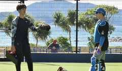 先乗り合同自主トレに参加中 ラプソードを設置しブルペン投球
