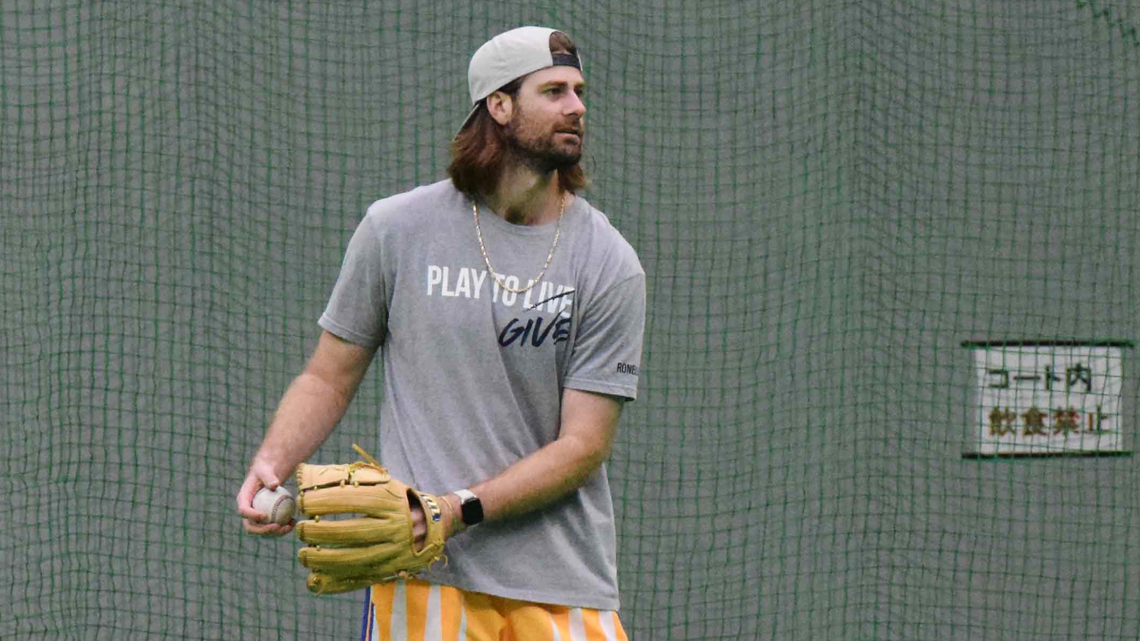 キャンプ地の名護に先乗りし、キャッチボールに汗を流すガント(撮影・宮西雄太郎)