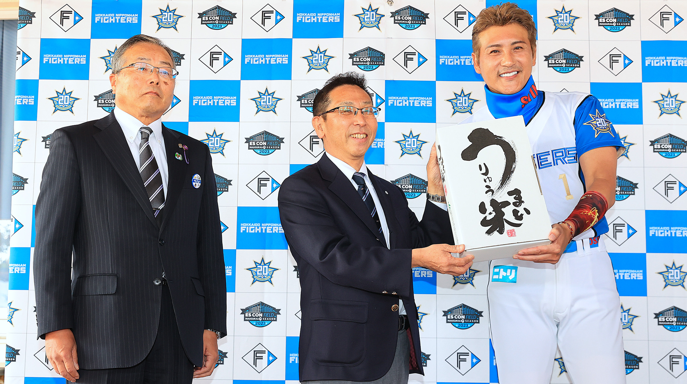 日本ハムの新庄剛志監督(51)が3日、雨竜町の西野尚志町長(62)から特産品「うりゅう米」の目録を贈呈された。「はい、いただきました!」と元気いっぱいに受け取った指揮官は、満面の笑みを浮かべて記念撮影に応じた。