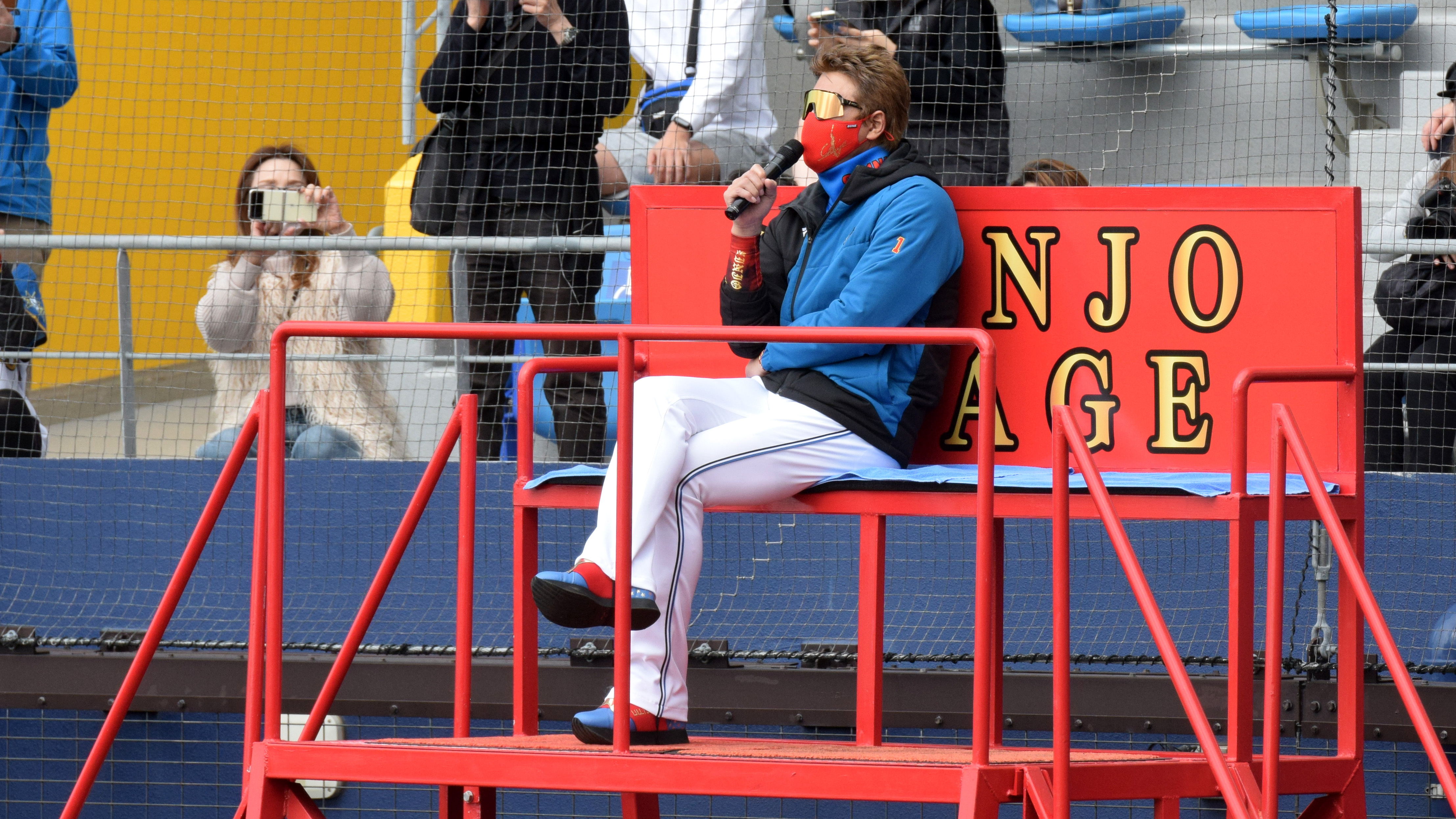 「SHINJO STAGE」からグラウンドへ向けて指示する新庄監督