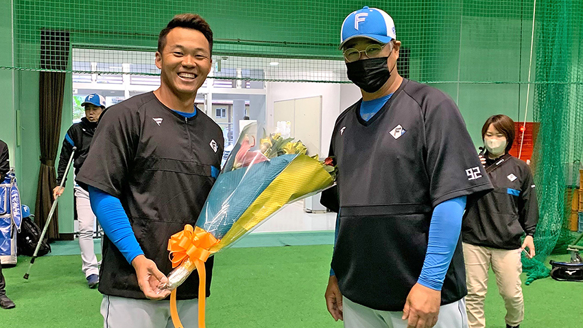 ワールド・ベースボール・クラシック(WBC)の台湾代表に選出されている王柏融外野手(29)が14日、2軍キャンプ地の沖縄・国頭村で木田優夫2軍監督(54)から激励の花束を贈られた。王柏融は「このような時間をいただきありがとうございます。一生懸命頑張りますので、台湾のことも応援してください」とコメントした。