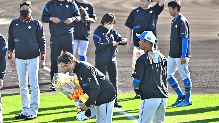 日本ハムの伊藤大海投手(25)が16日、キャンプ地の沖縄・名護を離れ、ワールド・ベースボール・クラシック(WBC)に出場する日本代表の合宿が行われる宮崎に入った。出発前には首脳陣、チームメート、スタッフにあいさつ。新庄剛志監督(51)から「思い切り勝負にいって、打たれてもいいから四球を出さないように」と激励され、花束を贈られた。