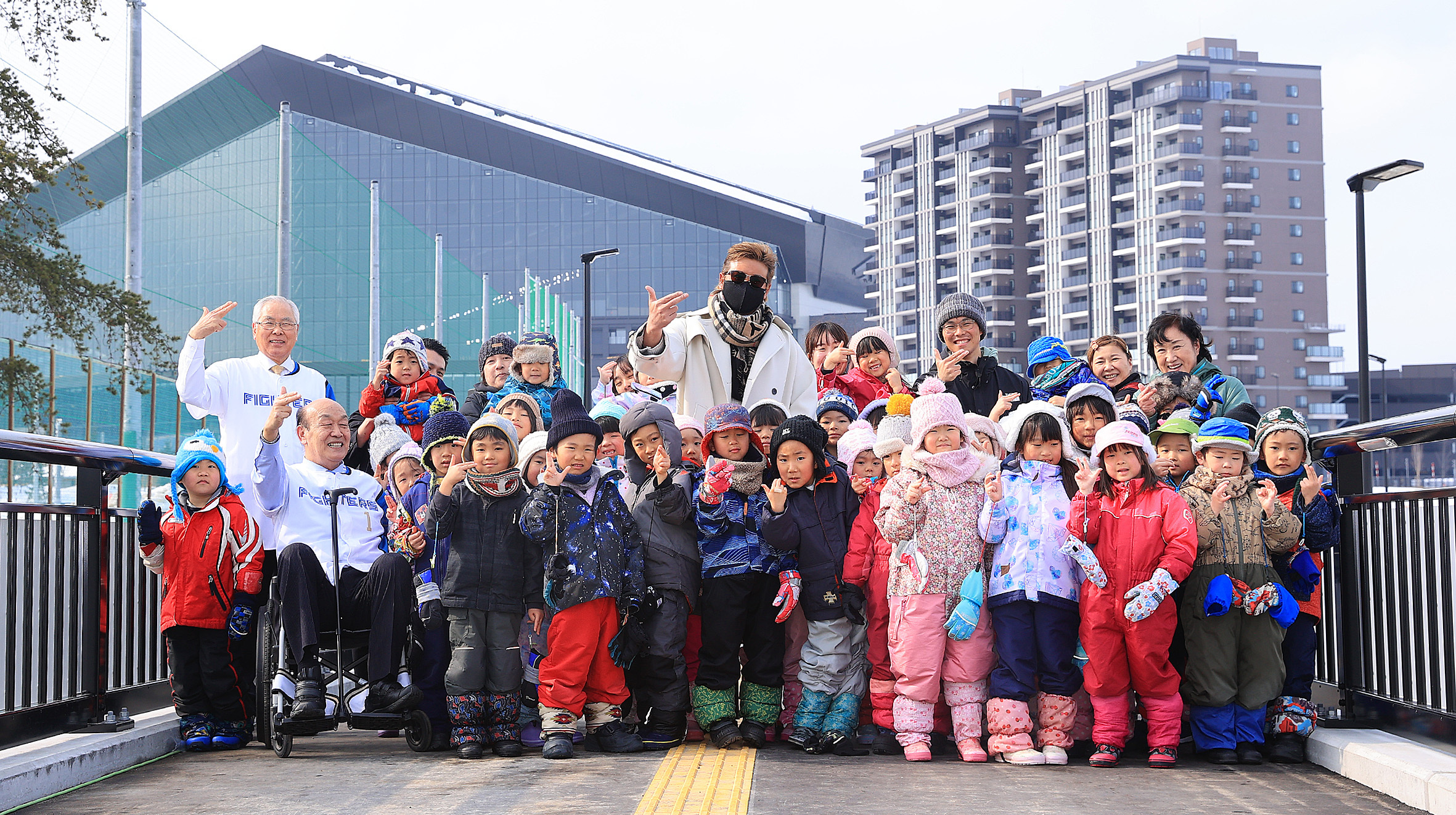 指揮官は園児たちとともに歩道橋を渡り、新球場をバックに笑顔で記念撮影を行った。