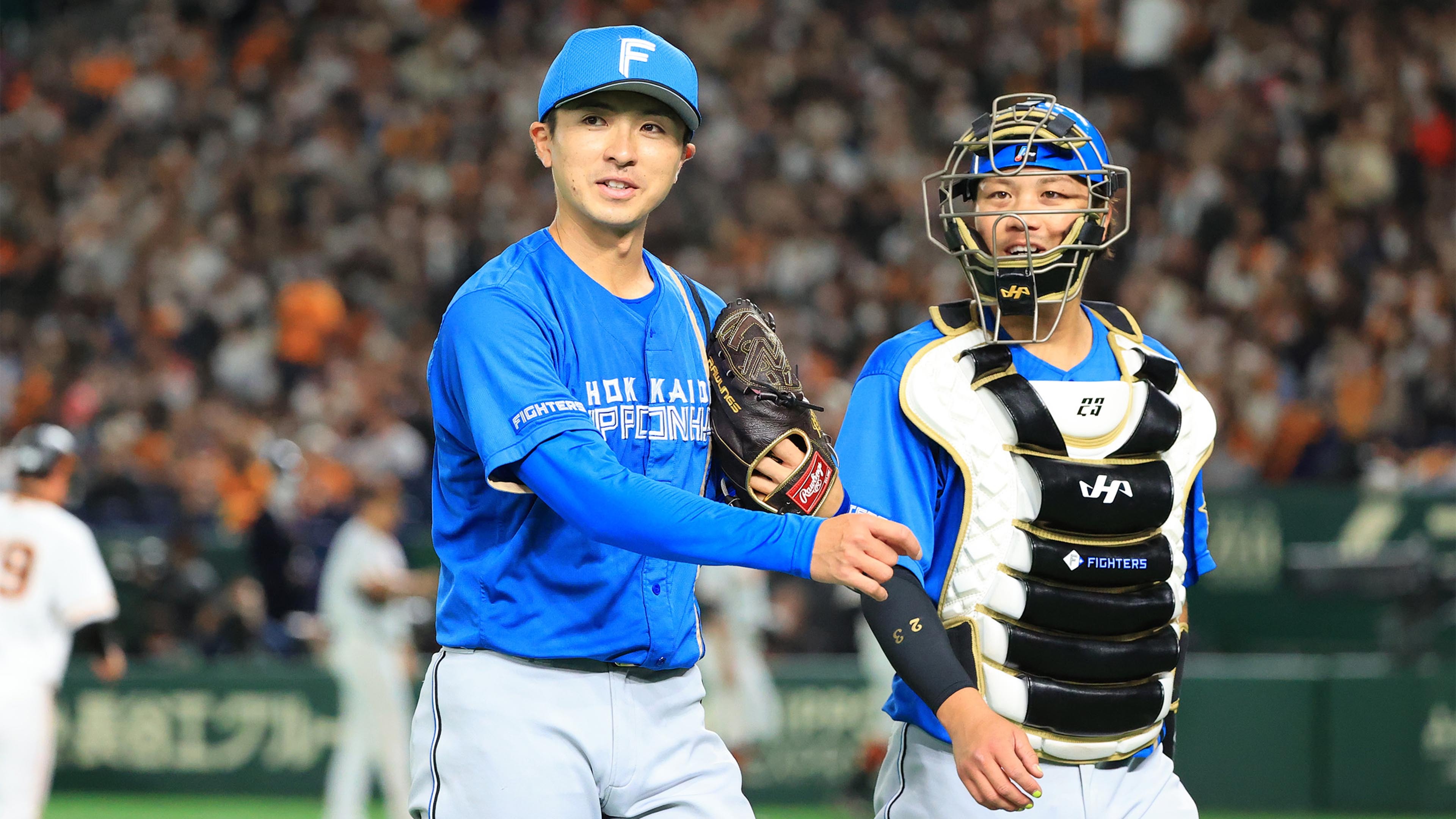 四回の投球を終え、伏見(右)とベンチに戻る上沢(撮影・松本奈央)