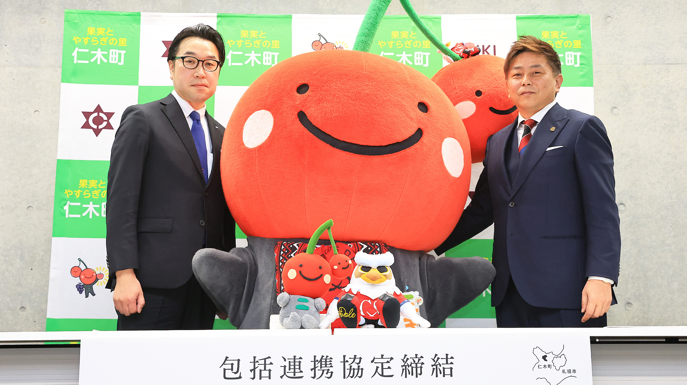 株式会社コンサドーレは1日、仁木町と包括連携協定を締結し、川崎戦前の札幌ドームで会見を行った。道内の市町村と包括連携協定を結ぶのは仁木町で16カ所目。今後は仁木町が目指す、子供から高齢者まで幅広い世代の健康や生涯学習のためのスポーツ推進、食・観光の振興、地域資源の活用と町の魅力発信に協力していく。また、同町のふれあい遊トピア公園と、Jクラブとは初となる町民スキー場の指定管理者にも選定された。