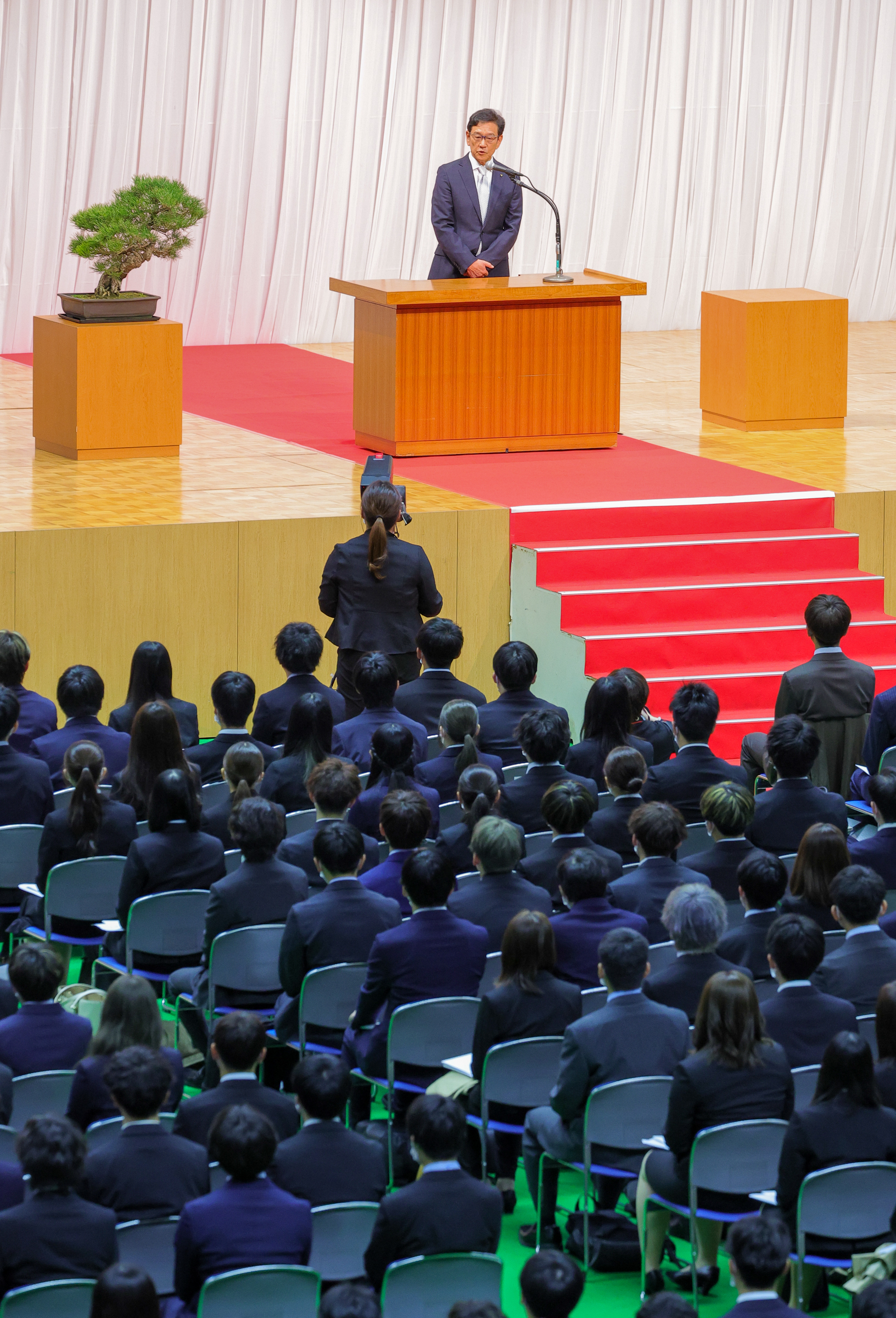 WBCでの戦いを振り返り、大谷の活躍についても紹介。新入生をゆっくりと見渡して「僕がずっと選手に言い続けてきた言葉をみなさんに送ります。挑戦し続けなさい。そして自分を信じ続けなさい。人は誰しもが大きな力を持っていて、自分がダメだと思った瞬間に終わってしまう。最後まで諦めず、自分を信じてあげてください」と訴えた。学生の新しい門出を祝福し、明るい未来を願いながらあいさつを締めくくった。