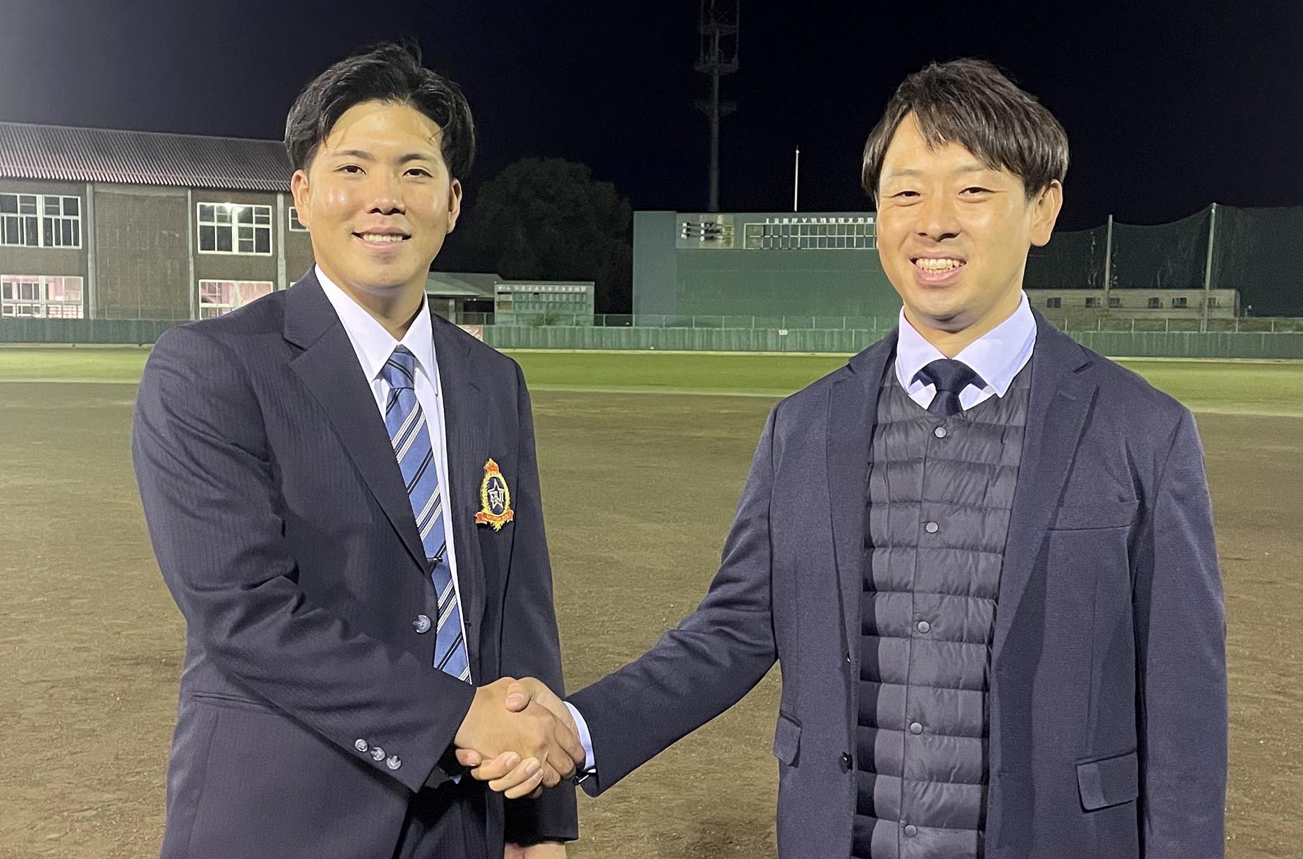 ドラフト会議の直後、富士大の安田監督(右)と握手を交わす金村(安田監督提供)