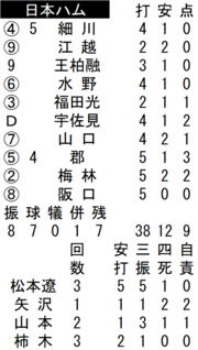 四回のマウンドには二刀流ルーキーの矢沢宏太投手兼外野手(22)が登り、イースタン・リーグ初登板。矢沢はいきなり2者連続四球で無死一、二塁のピンチを迎えた。その後2死一、三塁としたが、1番の長谷川に2点三塁打を浴び、1回1安打2失点の内容だった。