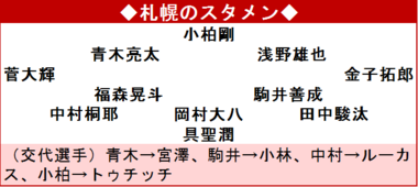 1点を先行され、2戦連続ゴール中のMF浅野雄也(26)や、リーグ戦5試合で3得点を挙げているFW小柏剛(24)を中心に相手ゴールへ迫るが、札幌の持ち味であるスピードを生かした攻撃の形をつくることができず。前節までリーグ2位の20得点をマークしていた攻撃は、鹿島の堅守にはね返された。