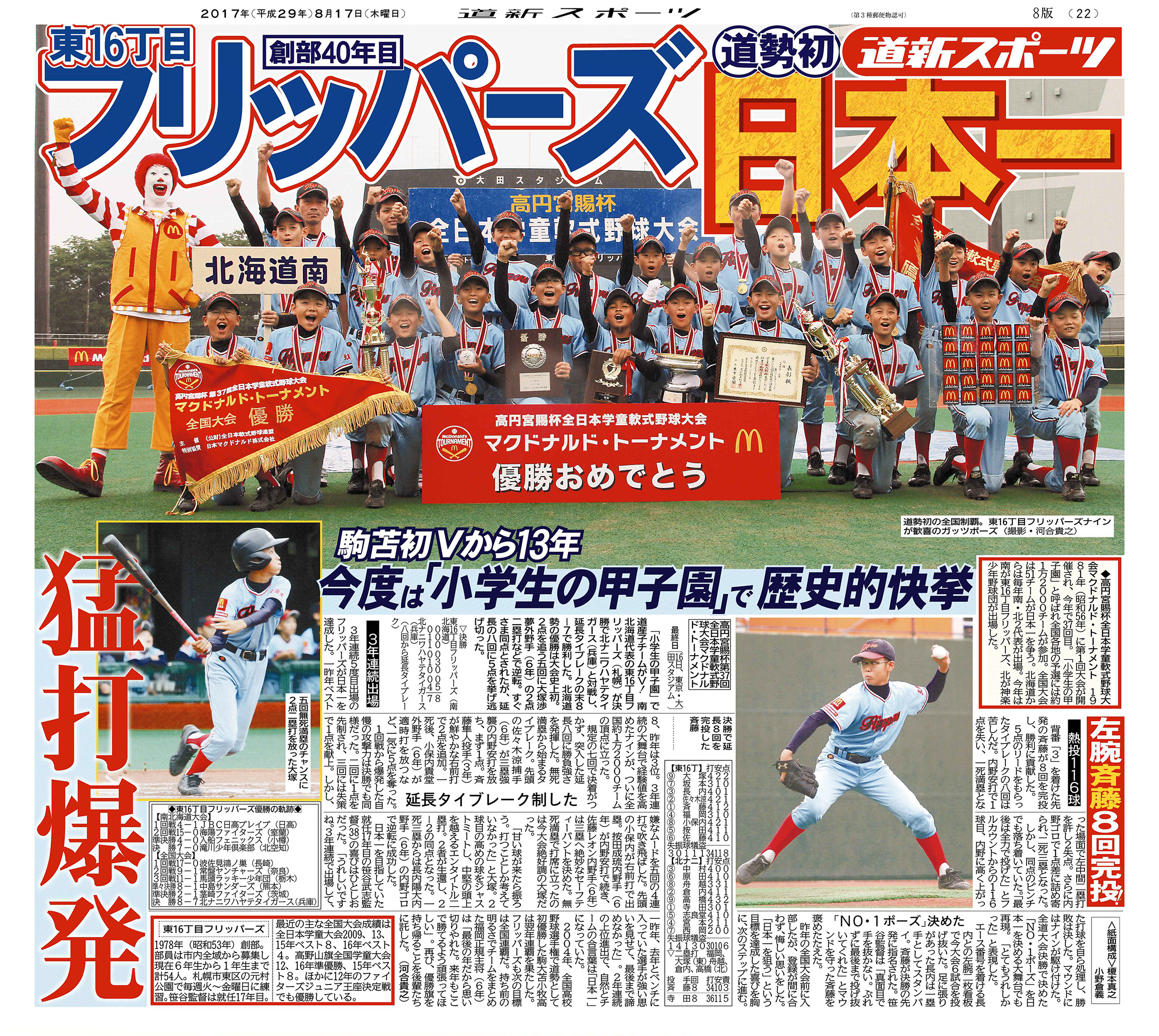 2017年夏、少年野球の札幌・東16丁目フリッパーズが高円宮賜杯全日本学童軟式野球大会マクドナルドトーナメントで北海道勢として初の優勝旗を手にしてから6年。当時のV戦士が高校最後の夏に向けて今年のシーズンをスタートさせた。道新スポーツWEBでは、選手たちに当時の大会を振り返ってもらいながら、高校最後の夏へ、それぞれの決意を語ってもらった。全3回で紹介する。