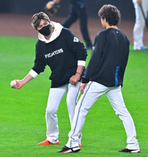 5日の楽天戦試合前練習で、新庄監督と話す鈴木(右)