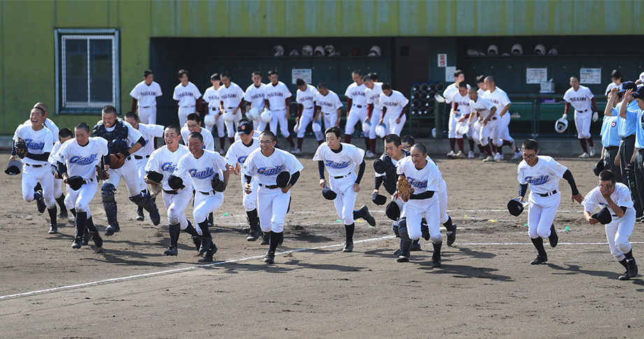 9年ぶりに春の全道出場を決め、三塁側応援スタンドに駆け出す岩東ナイン