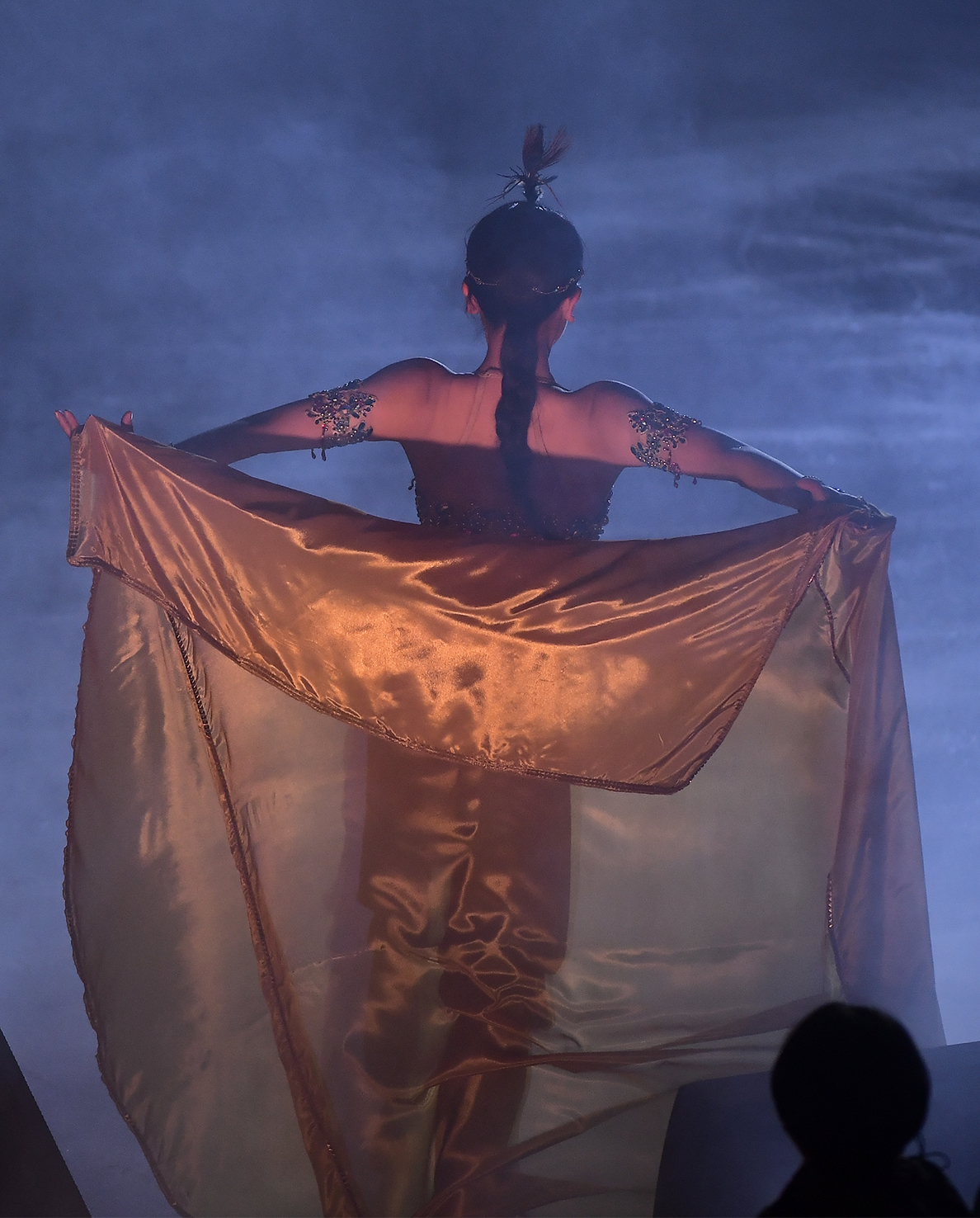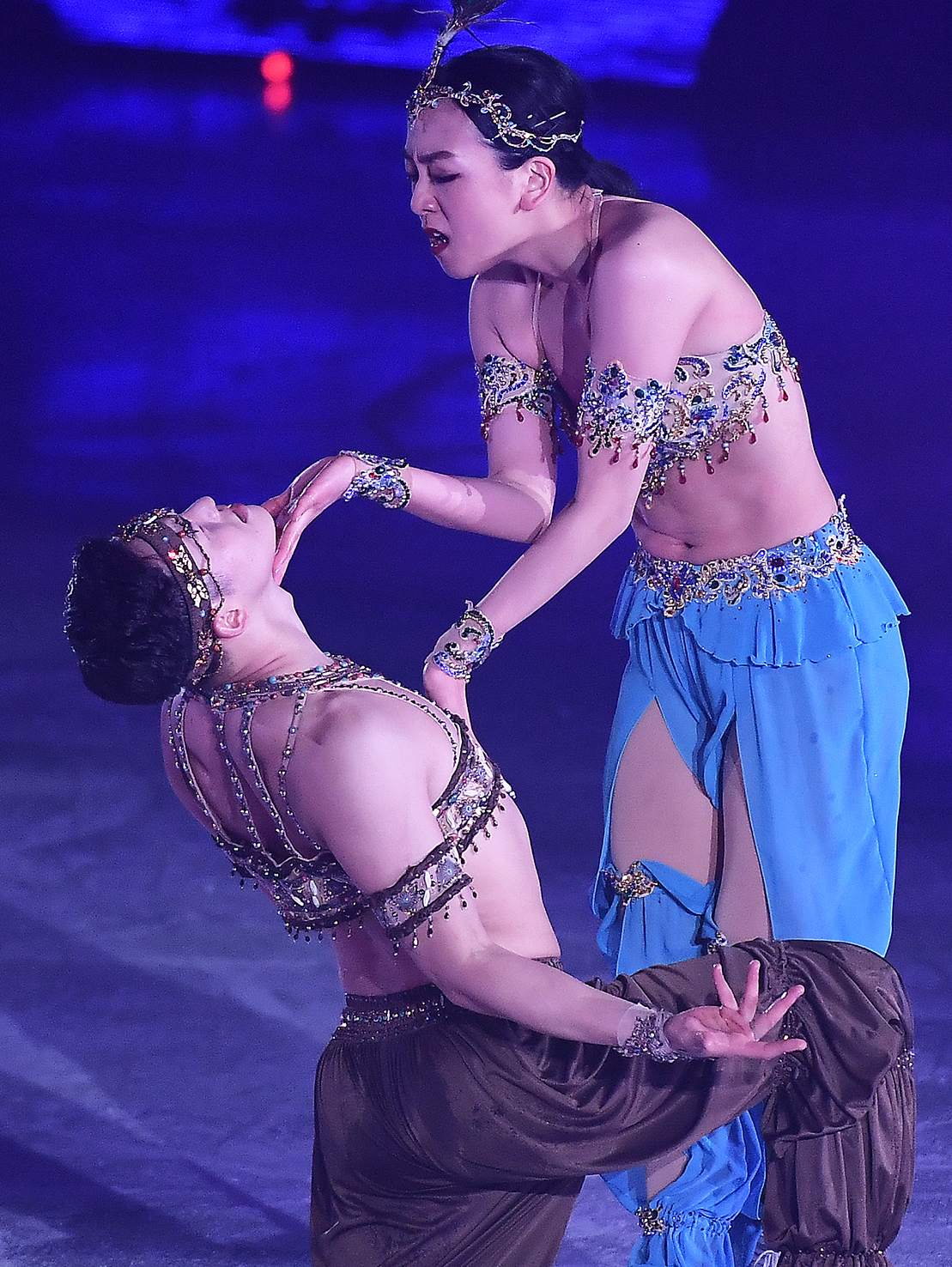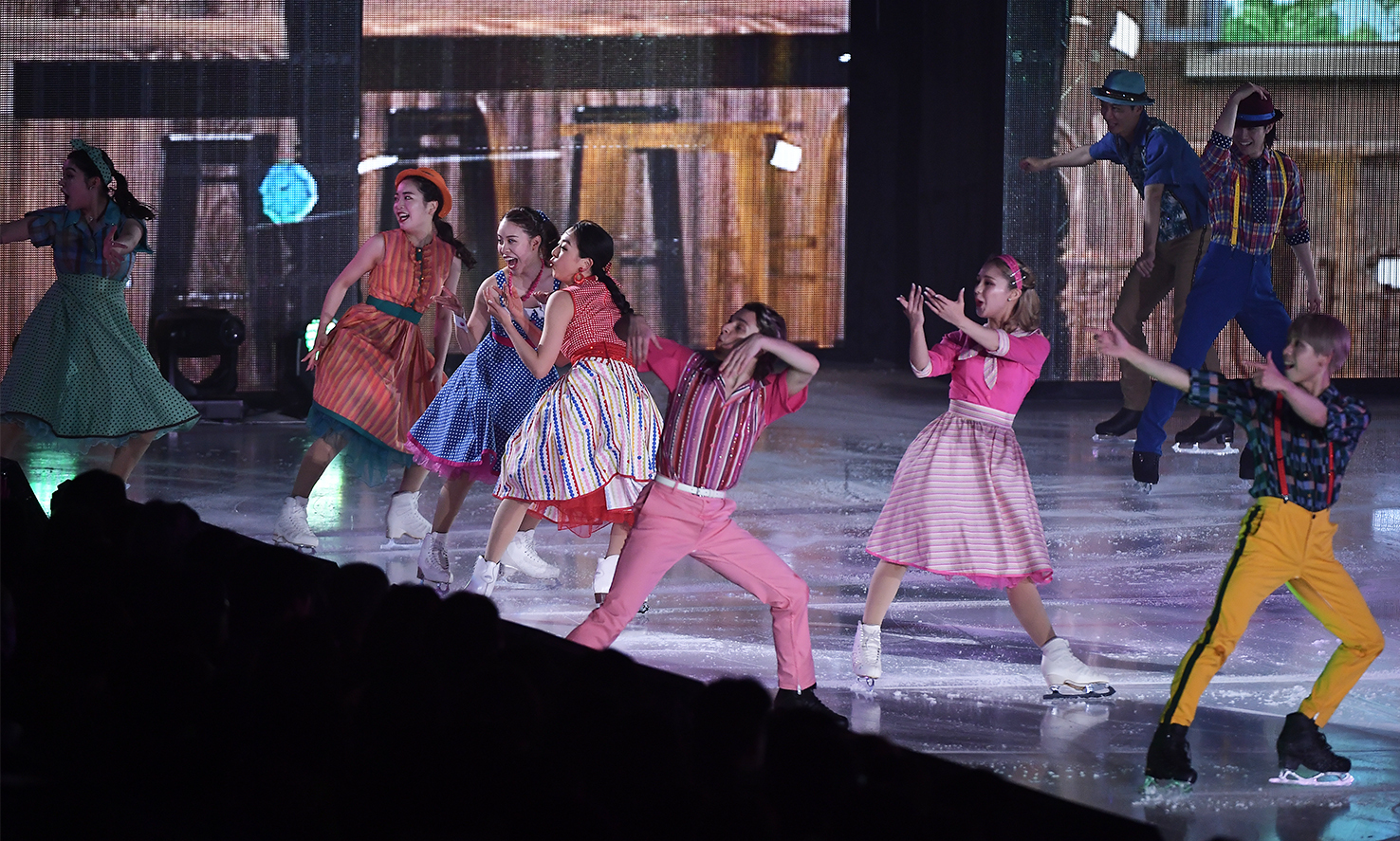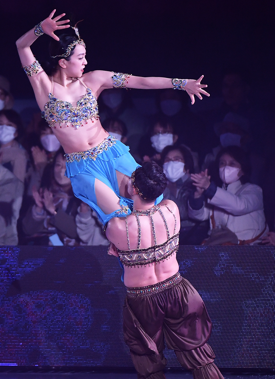 大型ビジョンの映像と多彩なライティングで氷上を演出。大音量の音楽が流れてキャスト総勢11人が登場すると、会場は大きな拍手で包まれた。プログラムは全15種あり、それぞれストーリー仕立で進行しており、異国情緒漂う衣装、会場を包み込む音響、あでやかかつ迫力のある振り付けが相まって、客席は常に興奮冷めやまず、熱気であふれていた。肌寒い会場では上着を一枚脱いでいる人も少なくなかった。
