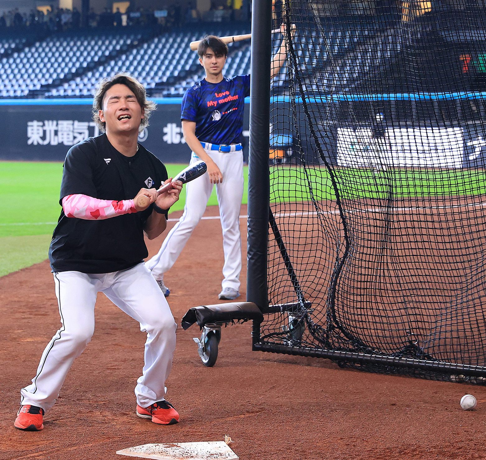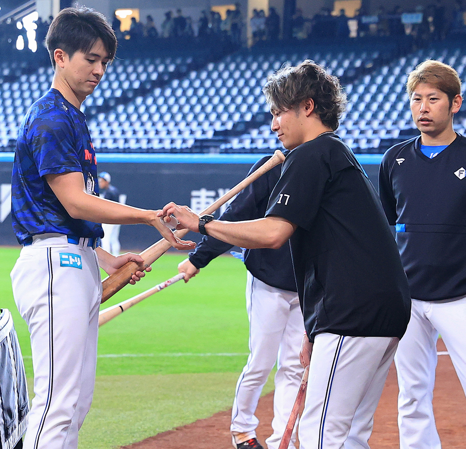 交流戦に向け、バント練習の準備をする上沢(左)と伊藤