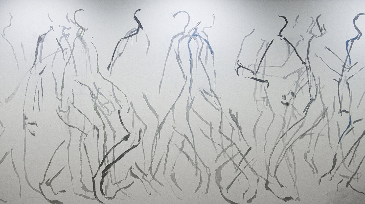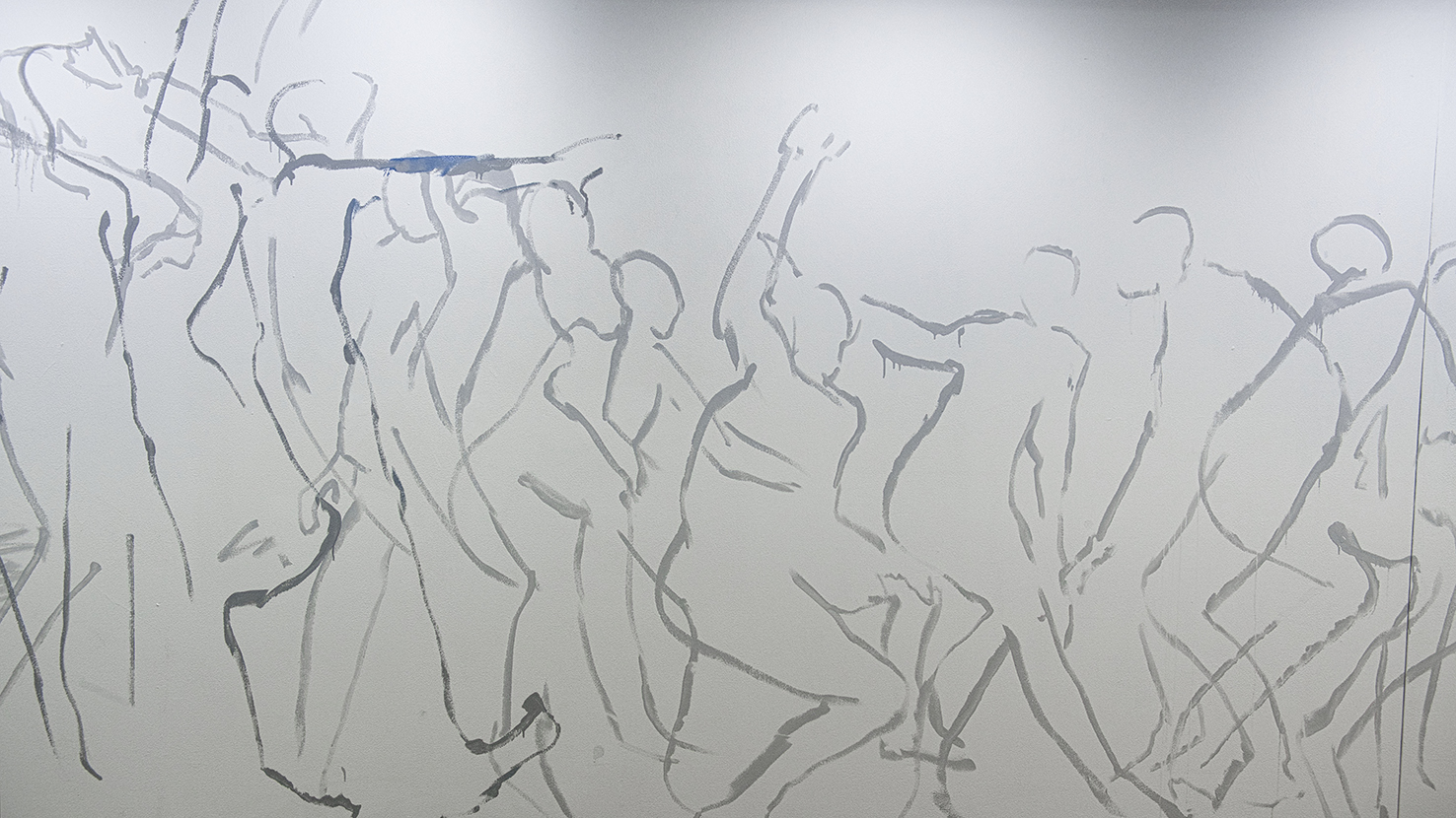 圧巻のライブペイントだった。2013年の「TOBIU CAMP」ではダンサーの東海林靖志さん(40)と即興描写を展開。「あのときはすごかったです。東海林の動きが冴え渡っていて、途中からは〝ダンスアートハイ〟になってました」。時間にして6時間。全身黒塗りの東海林さんが踊り続け、その動く〝黒い物体〟を富樫さんは壁面に模写。気付けば、日も暮れていた。「暗くなってからのことを前提として作っていた。夜になって、黒塗りの人に照明を当てたら、それが影になって(壁に)投影される」と説明した。