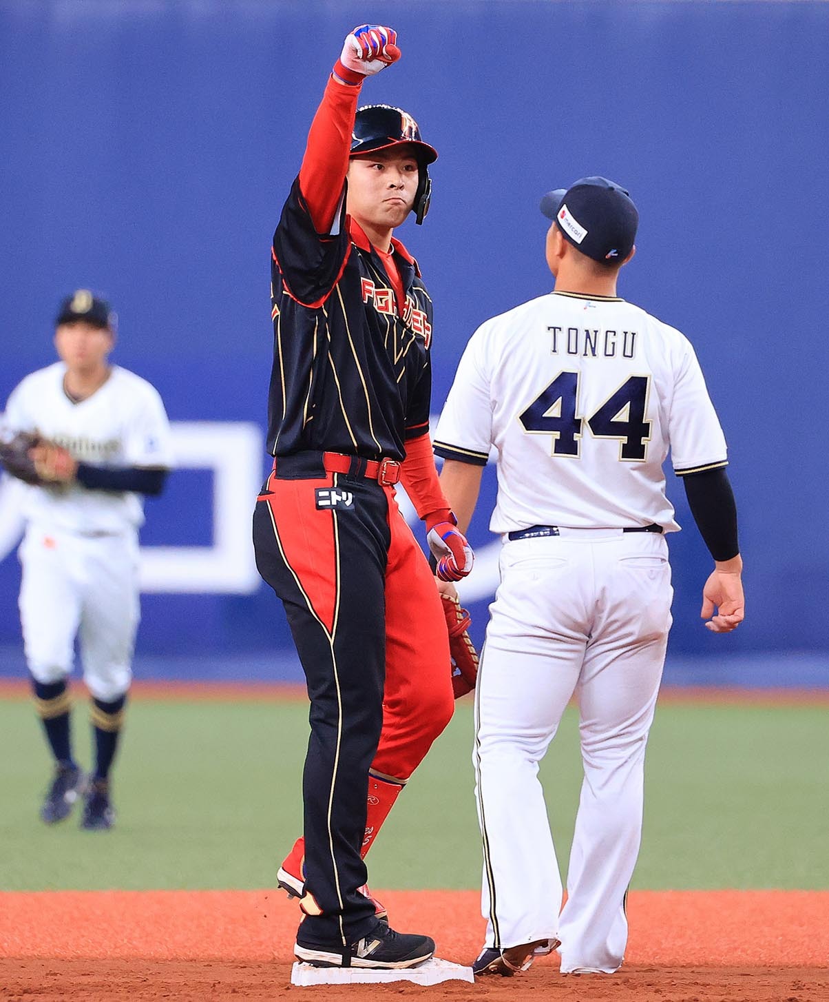 二回1死一、二塁、先制の2点二塁打を放った野村が塁上でガッツポーズを見せる