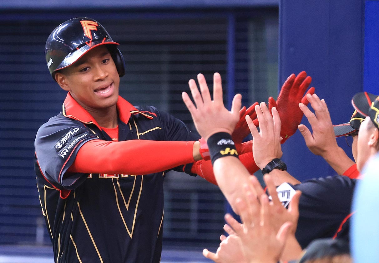 五回2死、左越え本塁打を放った万波がチームメートとハイタッチを交わす