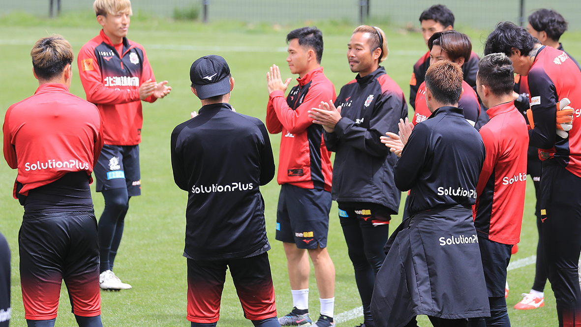 練習前の円陣で仲間から祝福されたスパチョーク。「いつも誕生日は家族と一緒に食事するんだけど、今年は1人。ちょっと寂しい感じ」。25度目の記念日は通訳のティーさんと過ごす予定だそう。