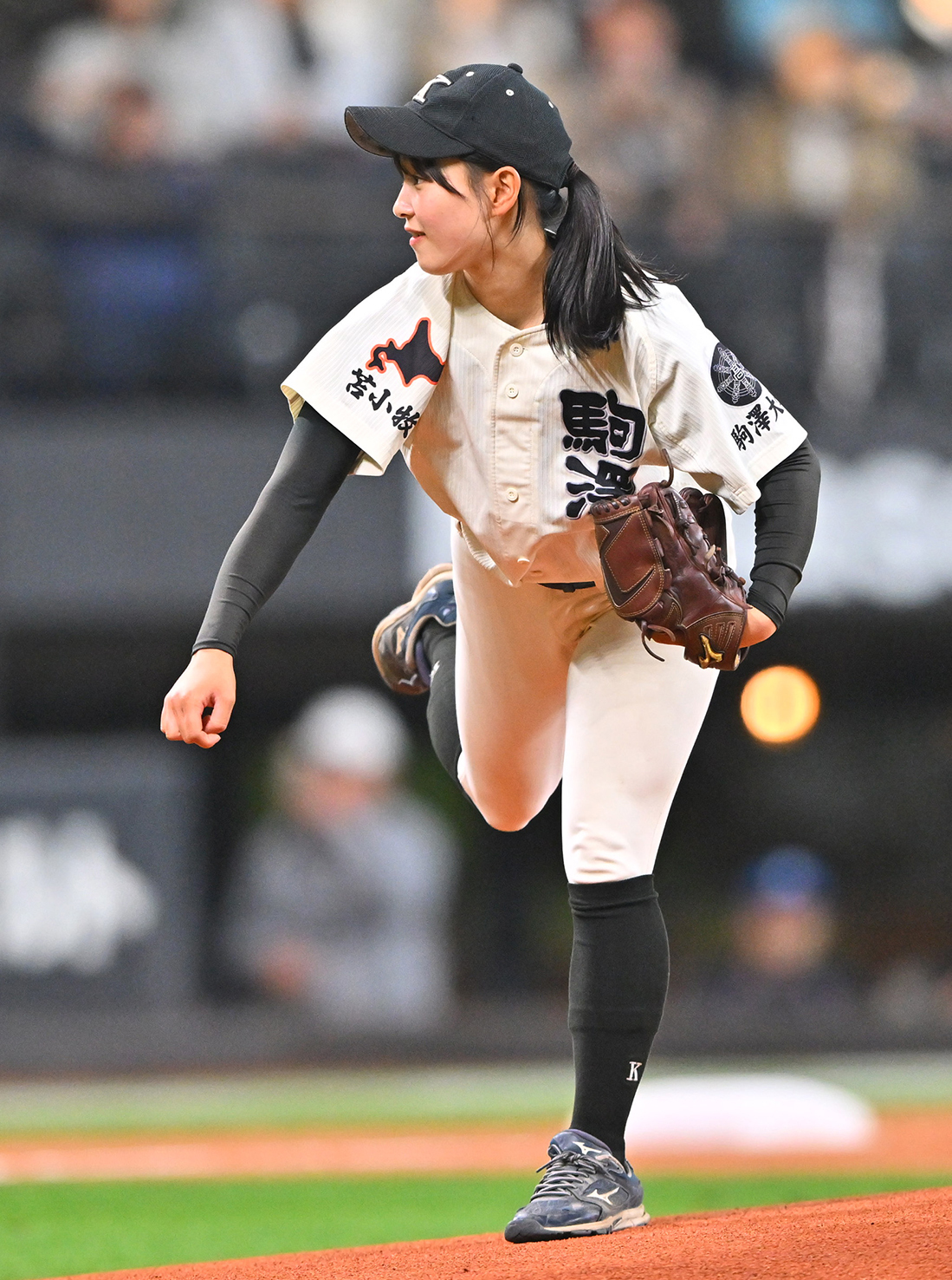 始球式に登板した駒苫女子硬式野球部の吹越投手