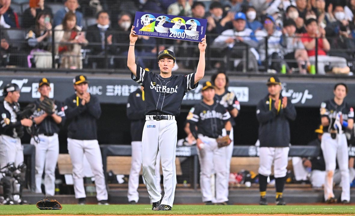 二回裏終了後、通算2000投球回を達成し記念ボードを掲げるソフトバンクの和田