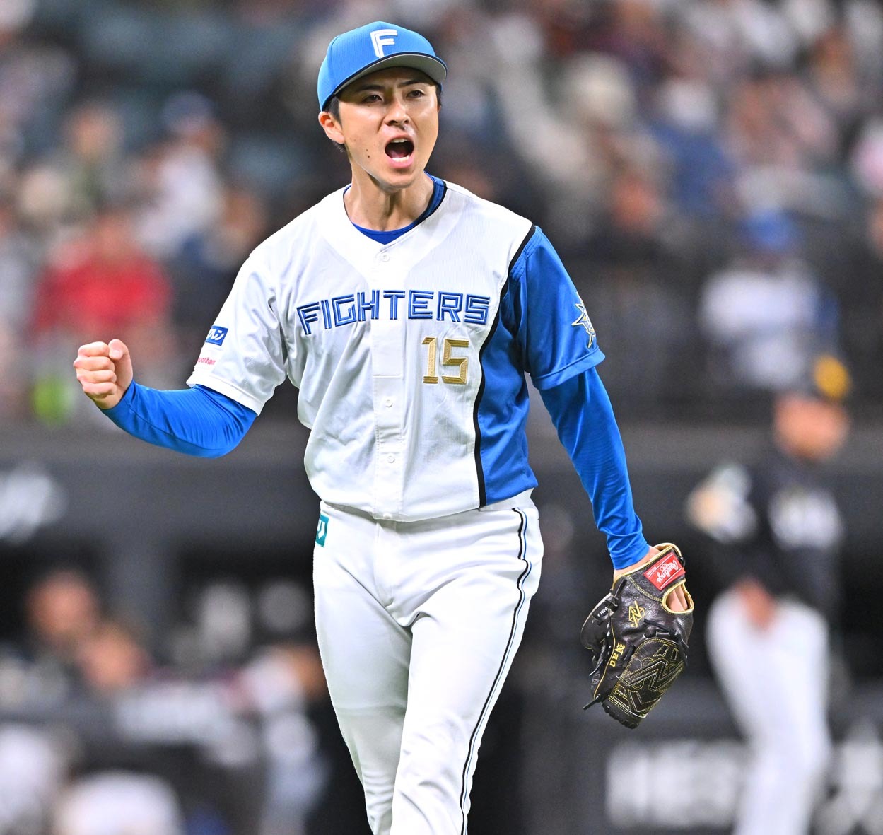 六回2死一塁、栗原を二ゴロに打ち取りガッツポーズを見せる上沢