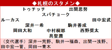 北海道コンサドーレ札幌は、ホームで横浜F・マリノスと対戦し、3-2で逆転勝利した。札幌はリーグ戦の先発から10人を入れ替え、ボランチで先発したMF深井一希(28)は、右膝前十字靱帯断裂からの復帰戦となった。攻撃的なチーム同士の試合で、序盤から互いにチャンスはつくっていたが決定機で決めきれず、前半は0-0で折り返した。
