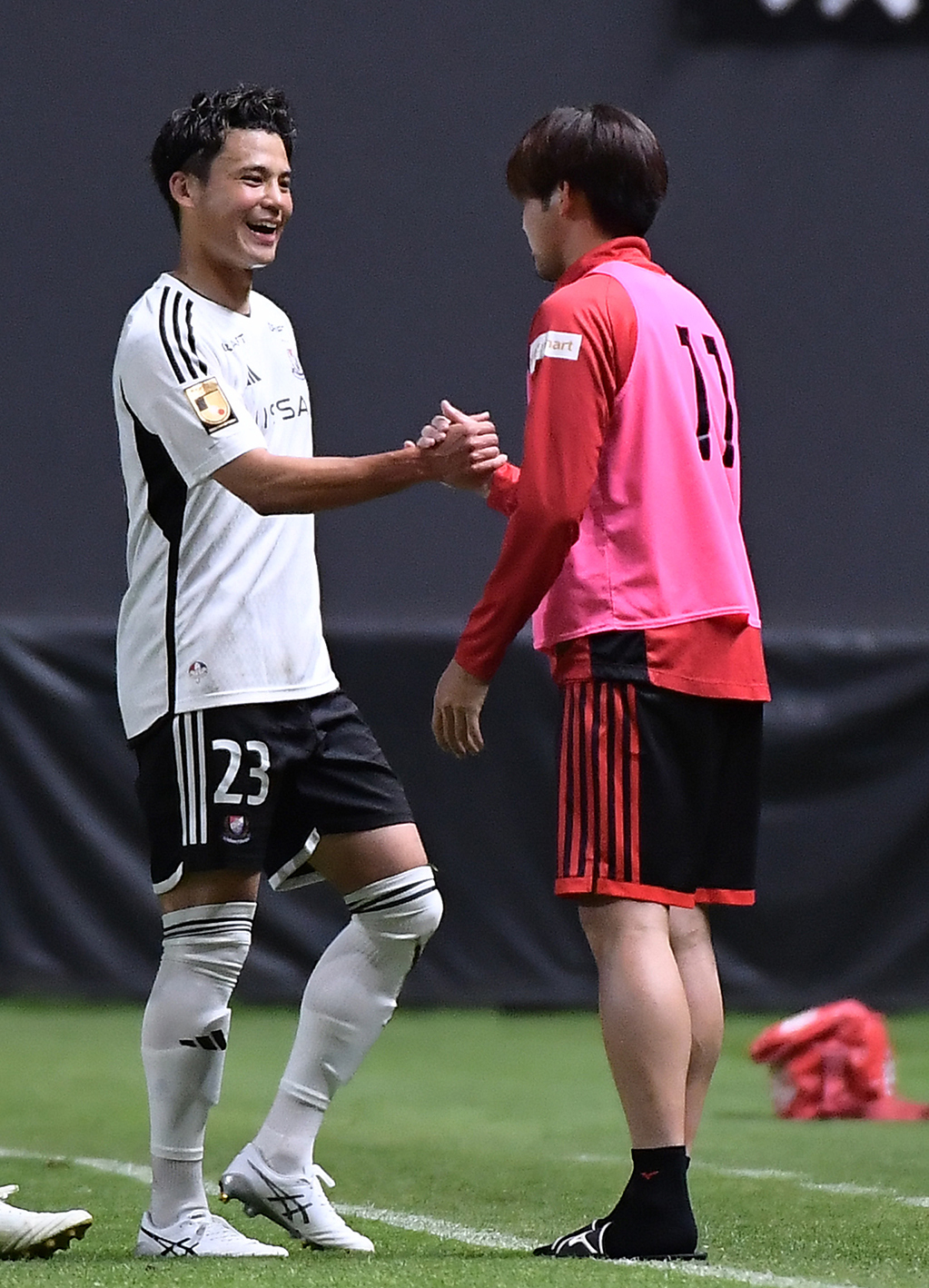 試合終了後、復帰戦となったお互いを称え合うMF深井(右)とFW宮市